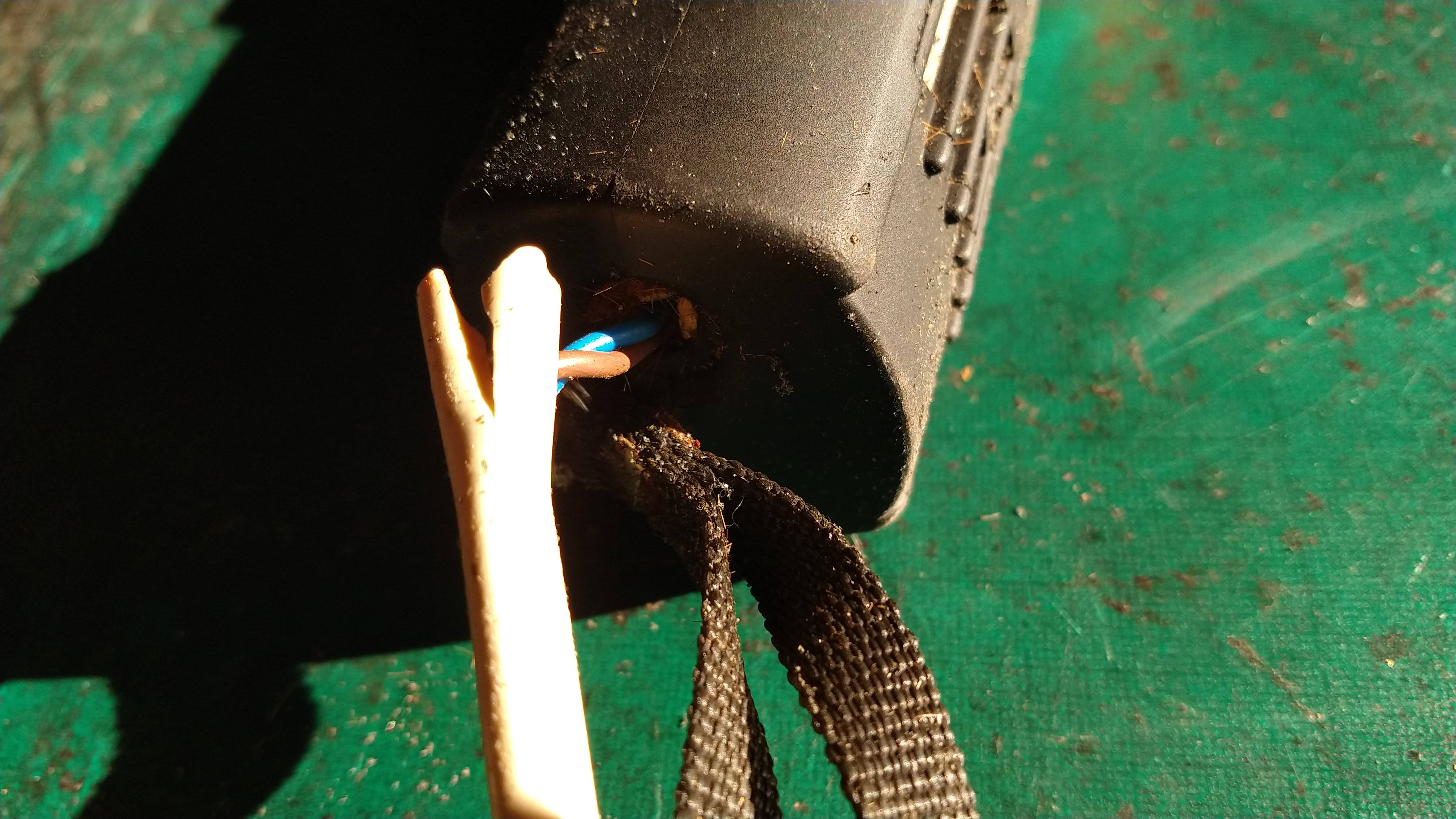 Damaged cable showing the inner wires or taped up.